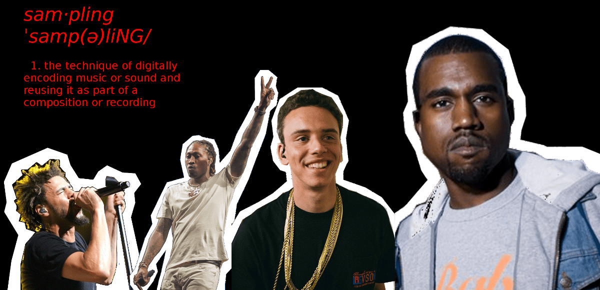 With this piece, my end goal in mind was to strictly emphasize on the prominent artists that were mentioned in the article, and to scale them accordingly in order of popularity and influence, as to have a more eye-catching image. The use of the white outline around each artist was meant to centralize the audience on the figures of Kanye West, Logic, J.Cole, and Future respectively, and to give importance of attention to each of them. I also chose to cut their figures roughly with straight lines rather than cutting around them through the utmost detail because I believed that having their figures cut in such a way would give a more neat and aesthetically pleasing look. The addition of the black background was used to accompany the white outlines as a way to draw out the figures, as some of them were cut out from images that had backgrounds that were difficult to differentiate from the figure. The incorporation of the word “sampling” on the image, along with the definition, also draws attention but also gives the audience the main idea of the article, as the article delves into how these different artist (mentioned in the article or in the playlist of songs) apply samplings of other songs into their own work.