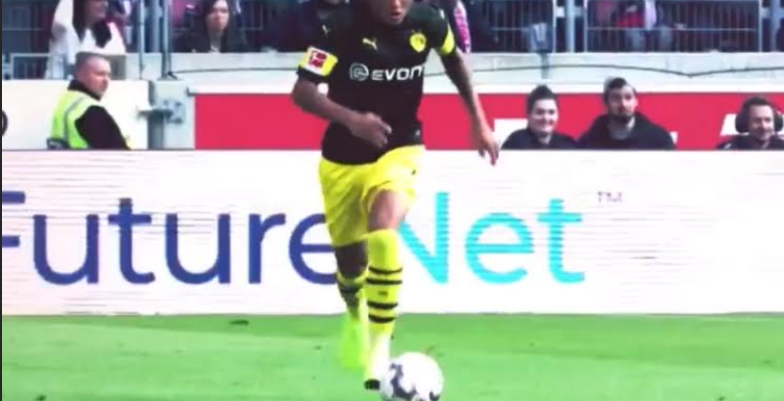 As Jadon Sancho accelerates past the fullback, cuts back on the side of the 18 yard box, making defenders fall, whips the ball to the back post and his teammate puts it in the back of the net.