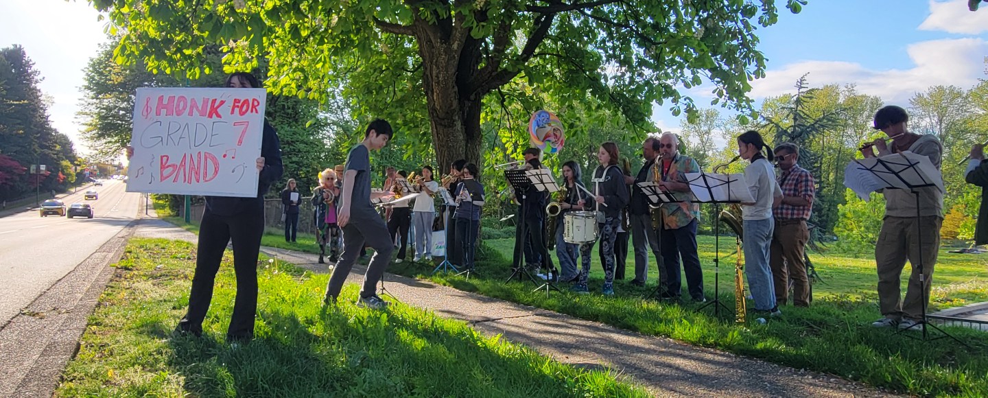 In late April, Byrne Creek Community School students, joined by others across the district, held a community celebration and peaceful protest outside the Burnaby School District office. They say that the purpose of the event was to “show how band builds community, joy, and lifelong relationships.”