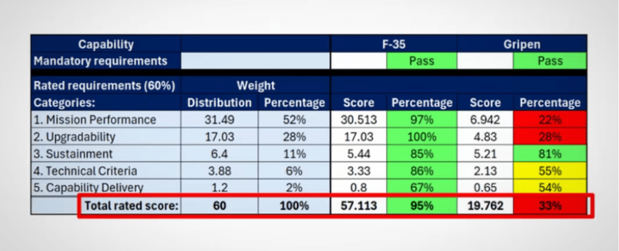 When the rated scores were combined, the F-35 achieved roughly 95% of the total available points, compared with about 33% for the Gripen. The size of the gap challenges claims that the competition was closely contested and instead points to a decision driven primarily by technical performance rather than political preference.